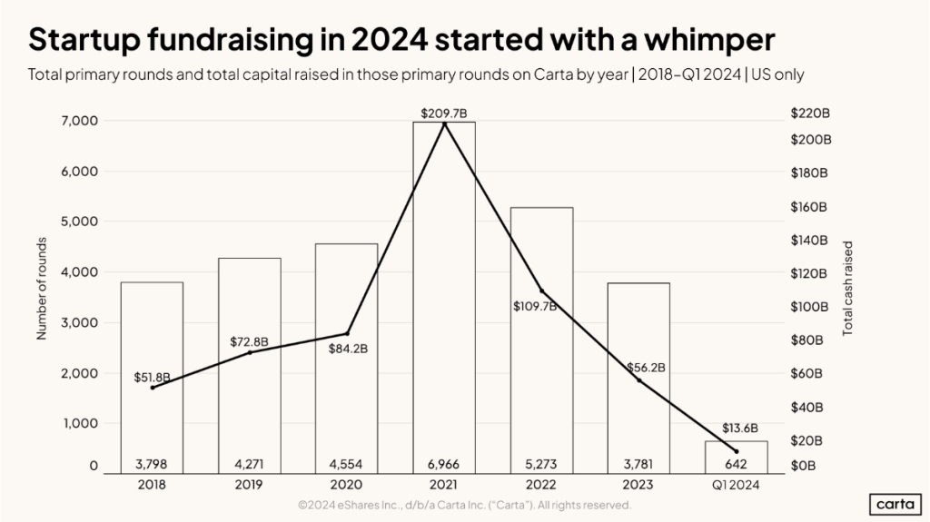 So, what does this graph mean? Well it’s not the hardest to understand, but as you can see the peak year for startups and raising capital was in 2021 (a historic year for VCs & startups) and since then has been plummeting. When we started 2024, I told people that I was expecting a slower rebound, but a rebound nonetheless. Yet, the data shows us that Q1 fell flat on its face. This graph shows that startups (using Carta) managed to raise about $13.6 billion in primary rounds this quarter, which is pretty much on par with the previous quarter. At first glance, it’s neither good nor bad – but lacking growth.