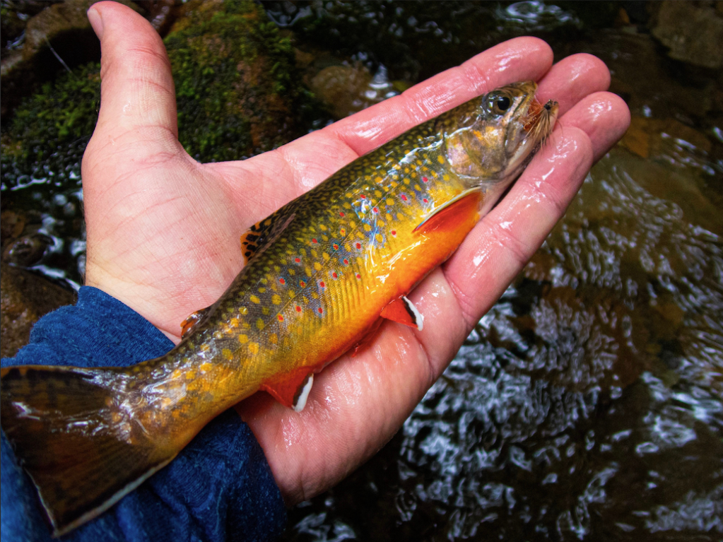 The original range of the brook trout encompasses much of the northeastern corner of North America, including the streams of the high Appalachians as far south as Georgia, and extending west to the Hudson Bay and Great Lakes Basins. Biologists identify two genetically distinct strains of brook trout—a northern and southern strain—with the boundary being the New River drainage in southwestern Virginia. The southern strain, often called “speckled trout,” is less diverse, making populations more fragile. The only native trout species east of the Rockies, the brook trout was an important quarry for the original European settlers. Starting in about 1850, the species’ range extended west through stocking. Other countries followed suit, and brook trout were introduced throughout Europe, in Argentina, and as far as New Zealand.